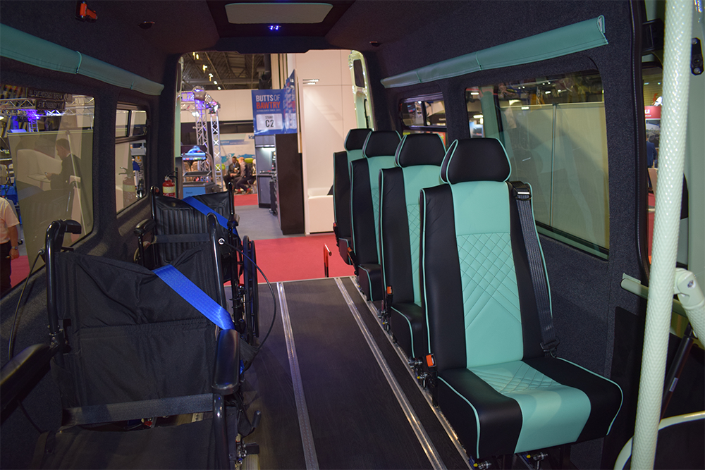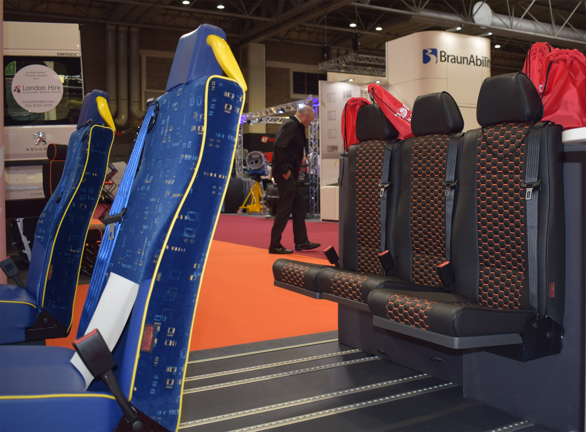 Also, featured on the stand over the 2 days was a stepped, 3 seater tip up taxi bulkhead system showcasing the latest trim styling available. Consisting of 3 tip up seats on a complete metal framework, the bulkhead system provides increased seating capacity without using up much need wheelchair access floor space plus providing easy installation for converters.